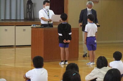 朝会後、日頃、読書を頑張っている人を表彰しました。今日までに、読書マラソンで表彰された子が23人になりました。
